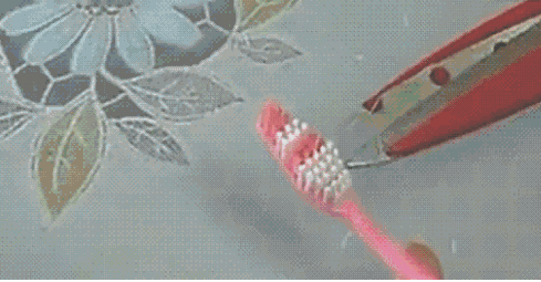 處理過的牙刷。用剪刀在牙刷的一側(cè)剪上幾刀,使牙刷的側(cè)邊變得參差不齊,用牙刷剪過的一側(cè)順著毛衣的紋路輕輕刮擦,也能去掉毛球。